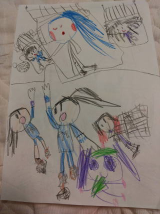 年中さんの孫が幼稚園で描いた絵を送ってくれました。我が家の誰もが絵がへたくそなので、ママに聞いたら「私も下手でした」誰に似たんだろう 感情が伝わる温かい絵に癒されます